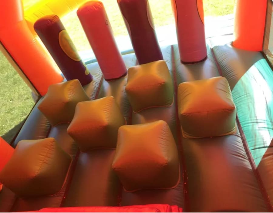 This obstacle course will go down a storm at parties or events. Featuring a large caterpillar and butterfly’s which makes this obstacle course not only very cute and different looking but suitable for all. The users enter through the mouth of the caterpillar then bounce their way through the entrance, they are then faced with the biff bash columns before having to deal with the inflatable stepping stones, once through they climb the soft foam steps to the top. Then its down the slide and out, then back around again.