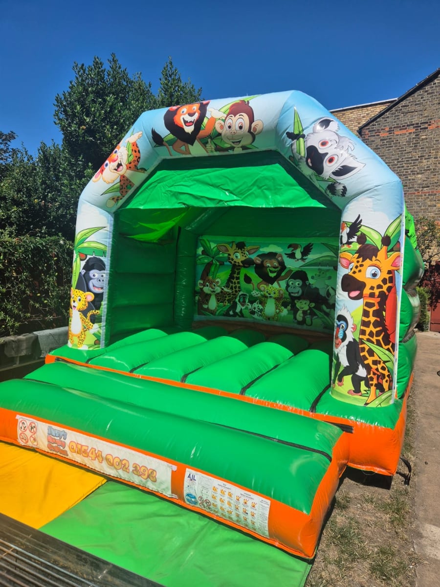 With a spacious 12ft x 12ft bouncing area, there’s plenty of room for energetic fun, while its open-front design allows for easy supervision. The vibrant green and animal-themed artwork makes this bouncy castle a great choice for a wide range of parties and events.