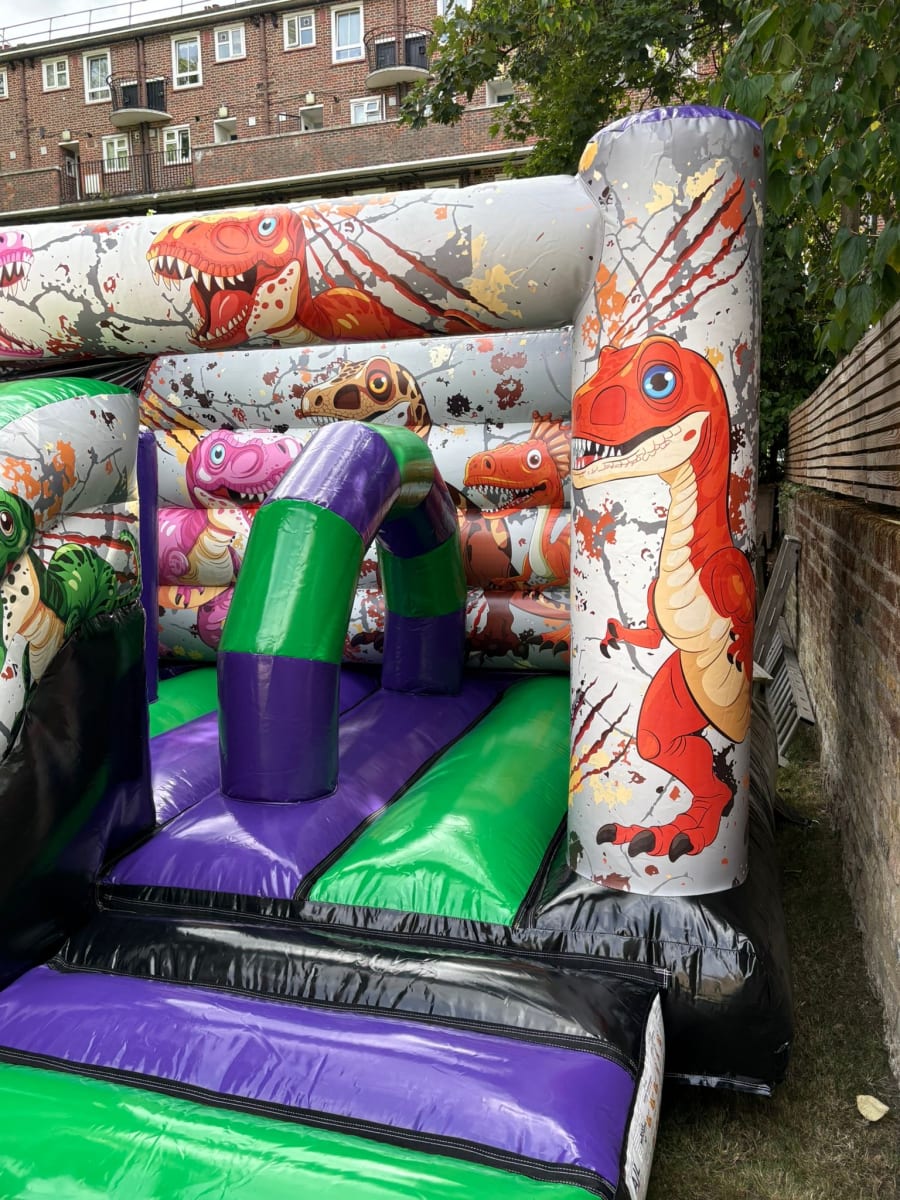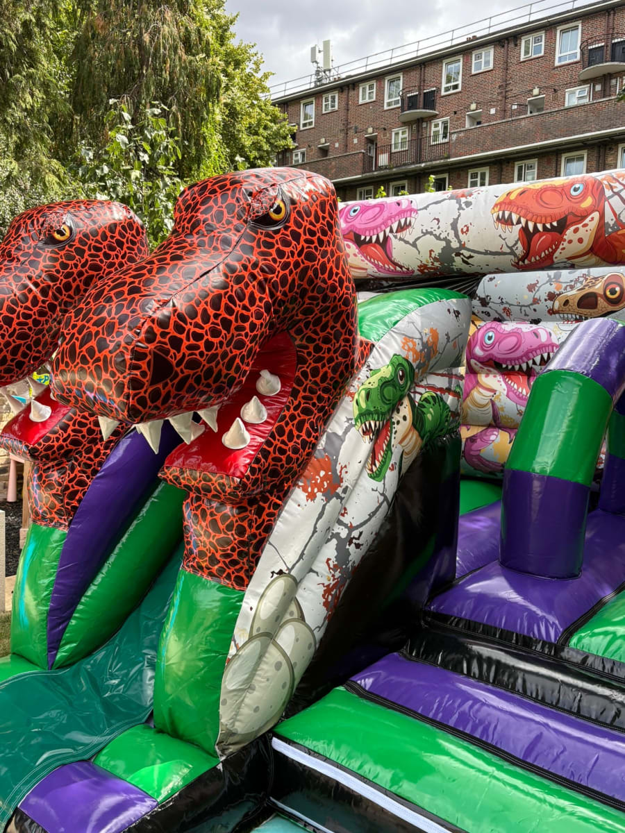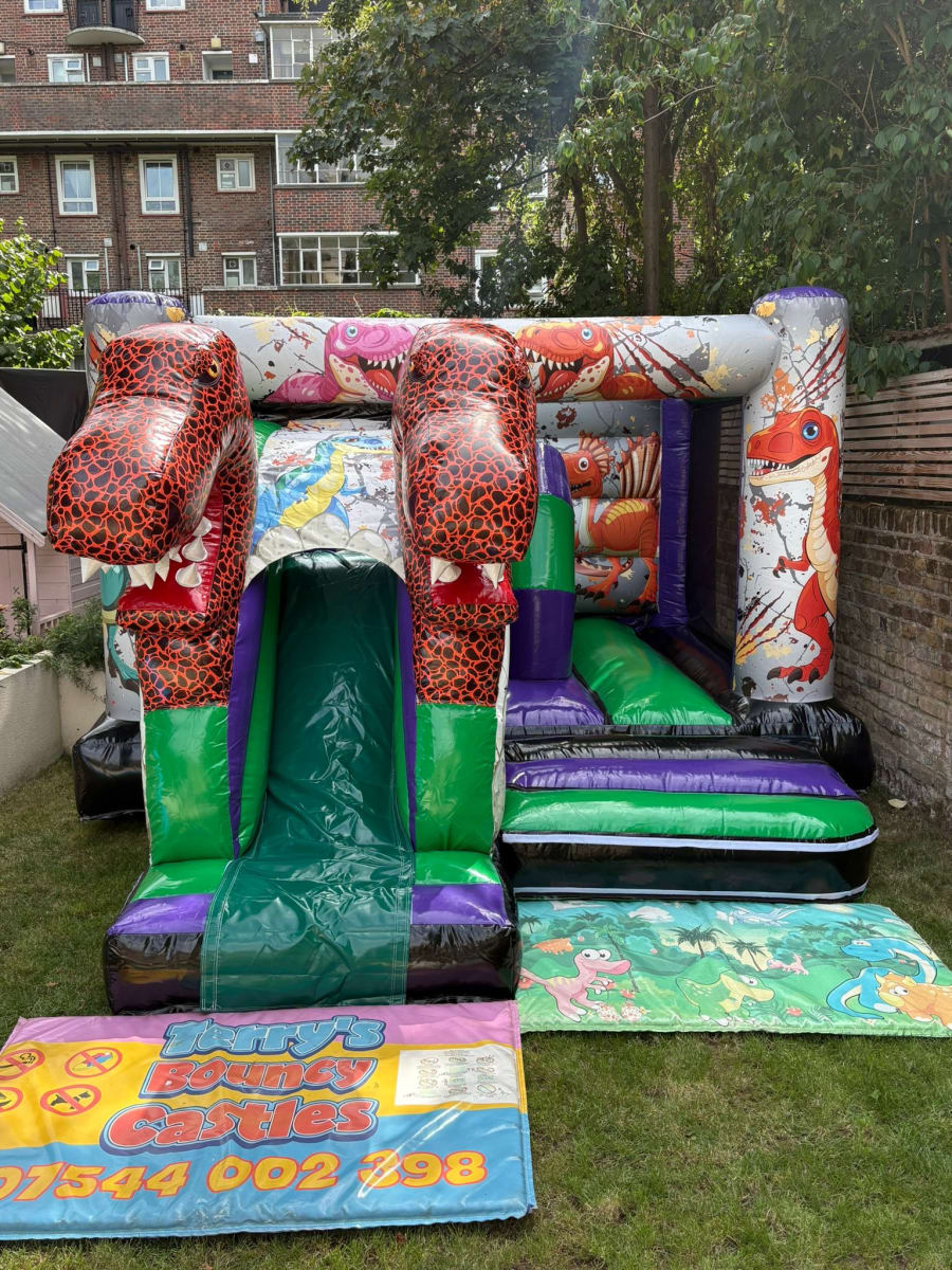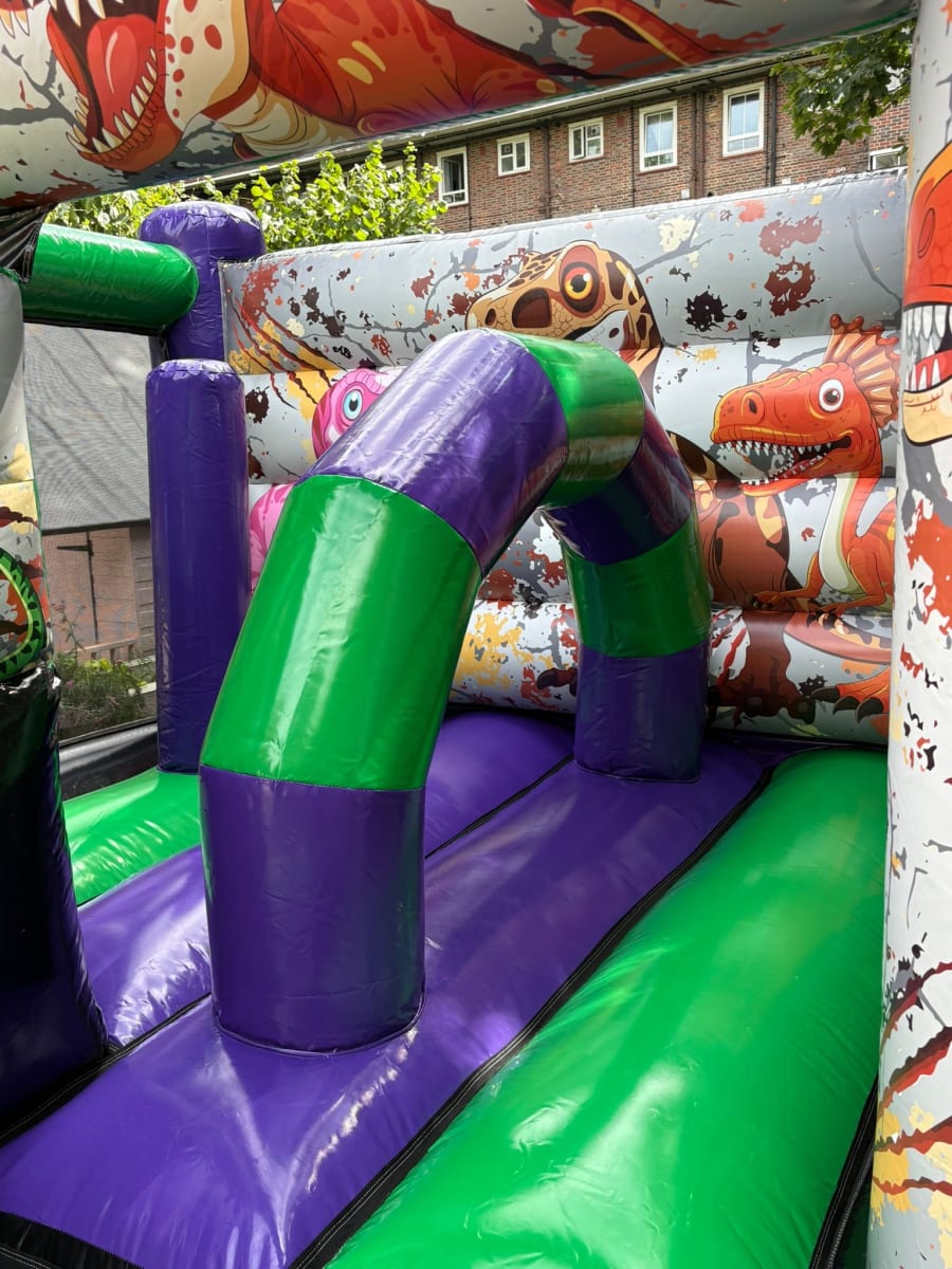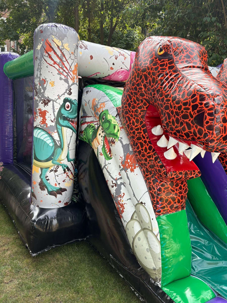 A fun-packed inflatable that combines bouncing and sliding in one action-filled unit — guaranteed to be a roaring success at any event! 🦖