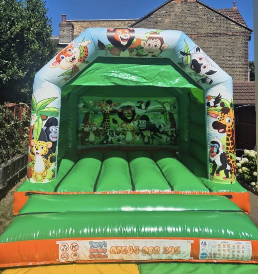 With a spacious 12ft x 12ft bouncing area, there’s plenty of room for energetic fun, while its open-front design allows for easy supervision. The vibrant green and animal-themed artwork makes this bouncy castle a great choice for a wide range of parties and events.