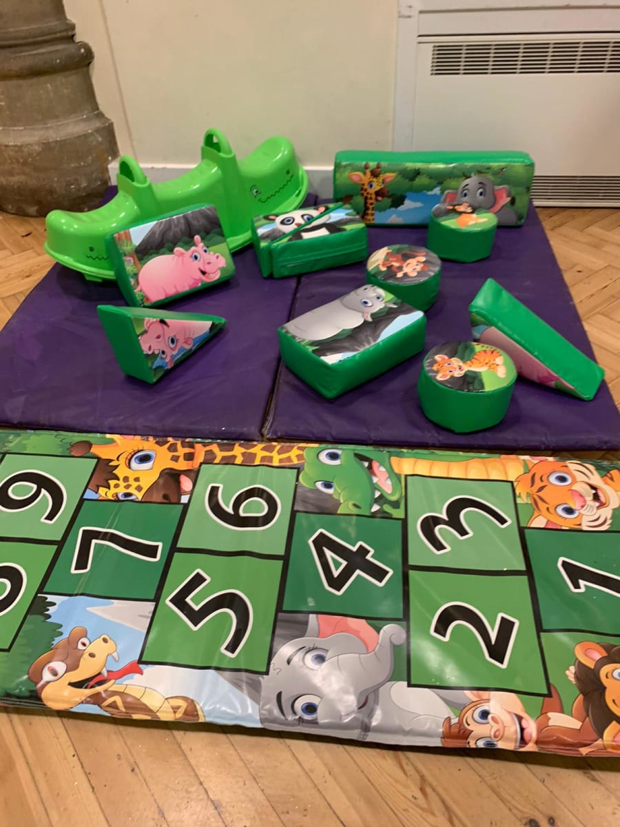 The set includes a crocodile double rocker, allowing two children to rock together, promoting social play and teamwork. There is also a soft hopscotch mat, adding an extra interactive element that helps improve coordination and number recognition in a fun, playful way.